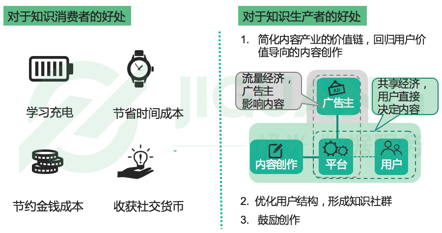 “知识消费者”一般为自我提升者、大咖粉丝或者效率至上追求者,而“知识生产者”则大多为有学识的人、大V、KOL或各个垂直领域的行家。而知识付费对于“知识消费者”的好处包括充电学习、节约时间及金钱成本、收获“社交货币”等。对于“知识生产者”来说,如今的知识付费则更具系统化益处:首先,这样的模式简化了内容产业的价值链,将内容创作回归到用户价值导向;其次它帮助优化了用户结构,形成知识社群;此外,知识付费也同时鼓励了创作。