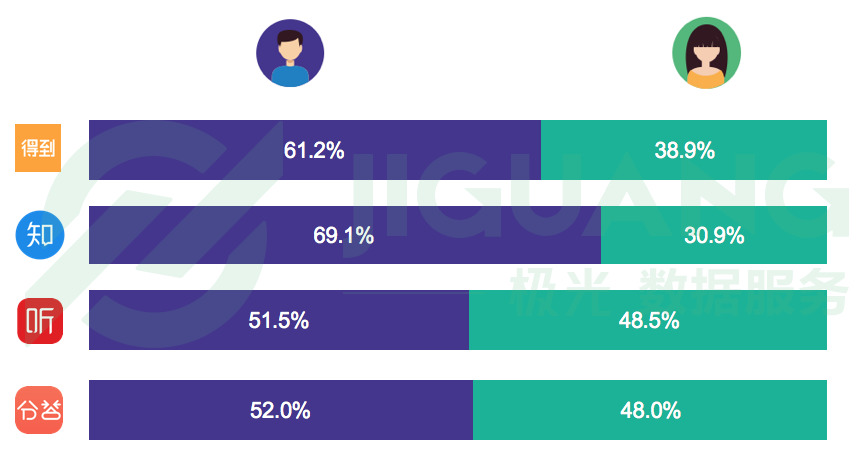 在用户性别分布上,知识付费 app 的男性用户比例稍高。其中得到 app 的男性用户占比为61.2%,知乎的男性用户占比为69.1%,喜马拉雅FM和分答的男性占比分别为51.5%和52%。