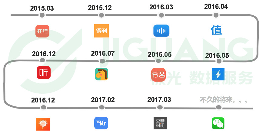 国内主流知识付费类 app 始于2015年。2015年一共上线了两款知识付费类 app,分别是果壳出品的“在行”,提供行家的“一对一” 咨询服务,于2015年3月上线;罗辑思维出品的“得到”则于2015年12月上线,主要提供知识干货、听书等知识服务。而2016年则是知识付费类 app 爆发的一年,先后上线了7款 app 和相关产品,包括腾讯众创空间孵化的“千聊”,知乎出品的“值乎1.0”,喜马拉雅FM推出的“123”知识狂欢节,LinkedIn 出品的“赤兔2.0”,在行内部孵化的付费语音问答产品“分答”,知乎推出的“知乎Live”以及新浪微博出品的“微博问答”,可见风口已经形成。2017年又陆续上线了36氪付费专栏“开氪”,豆瓣旗下的“豆瓣时间”。在不久的将来,也许社交霸主微信也会推出公众号付费服务。