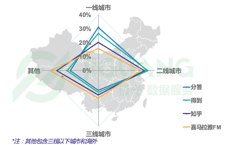 在城市等级分布方面,根据极光大数据 iAPP 监测得到的数据,知识付费用户更多集中在一线城市,分答尤为突出。喜马拉雅FM有用户下沉优势。