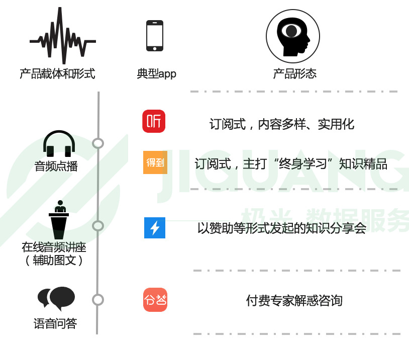 知识付费产品的载体和形式主要包括音频点播、在线音频讲座(辅助图文)、以及语音问答。而产品形态主要分为: