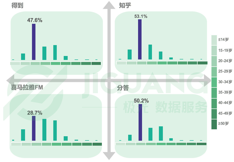 在年龄分布上,知识付费 app 用户年龄以2024岁为主。得到 app 的用户中2024岁占比为47.6%,知乎为53.1%,20~24岁用户占比在分答上则为50.2%,喜马拉雅FM人群分布较均衡。