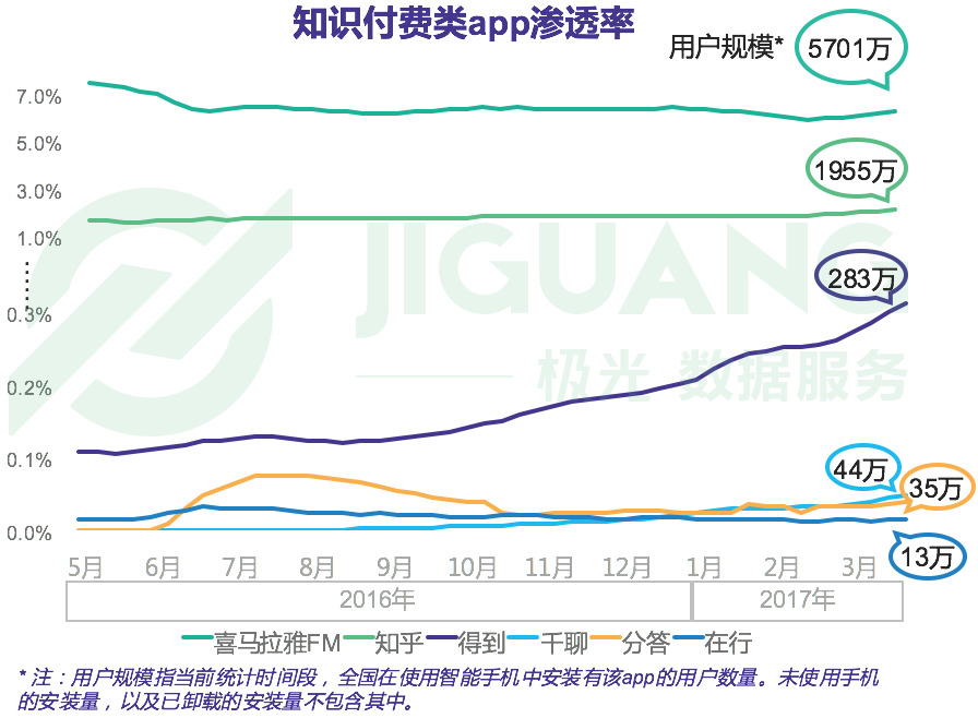 极光大数据 iAPP 监测平台得到的数据显示,在3月26日当天的渗透率排名由高到低分别为喜马拉雅FM(渗透率为6.33%,用户规模为5701万),知乎(渗透率为2.17%,用户规模为1955万),得到 app(渗透率为0.31%,用户规模为283万),千聊(渗透率为0.05%,用户规模为44万),分答(渗透率为0.04%,用户规模为35万),在行(渗透率为0.02%,用户规模为13万)。