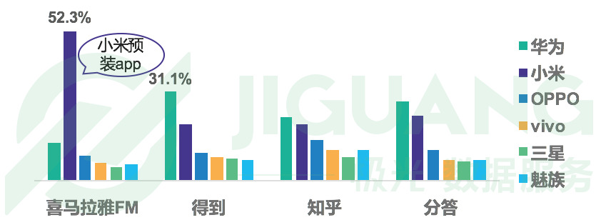 在安卓手机品牌分布上,极光大数据 iAPP 监测平台显示,知识付费 app 中,华为和小米手机用户占比高,其中得到 app 的华为用户高达31.1%。