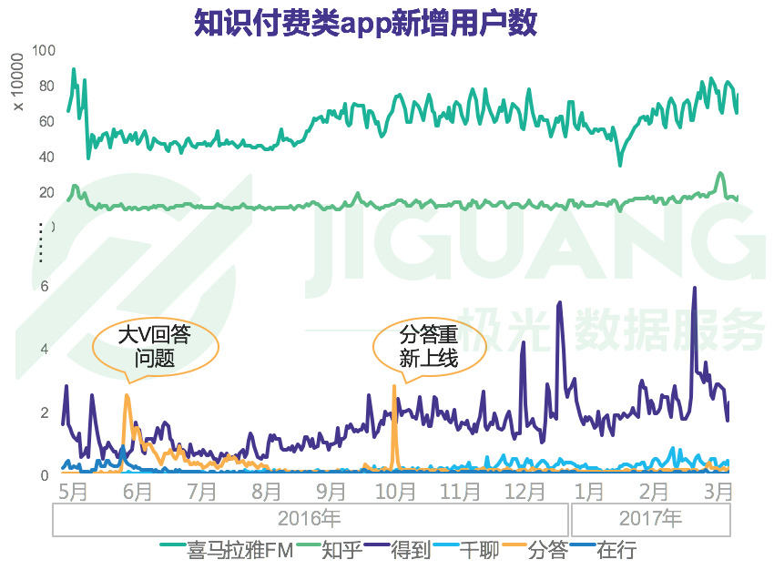 极光大数据 iAPP 监测平台显示,喜马拉雅和知乎的平台优势明显。得到 app 凭借《罗辑思维》IP 和罗振宇等知识网红不断增加用户关注。值得注意的是,分答上线不久后的6月,借助于大V回答问题的这一波营销,当日新增用户数突破过2万,而分答重新上线后的10月,当日新增用户数甚至突破过2万7千。