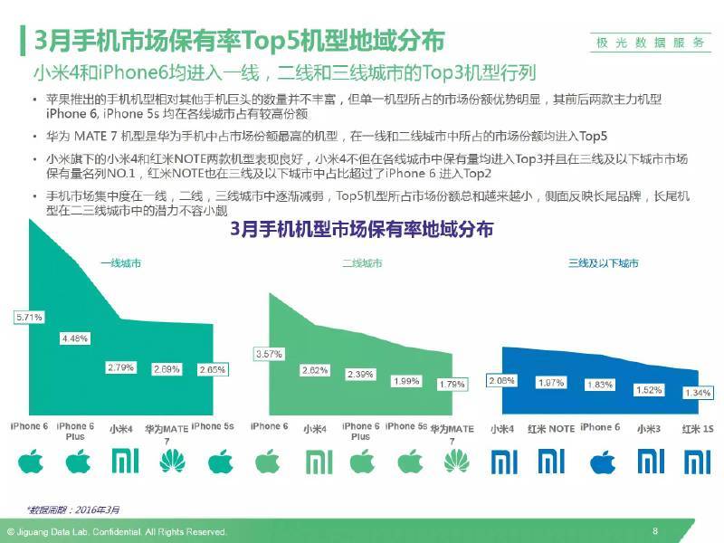 小米4和iPhone6均进入一线,二线和三线城市的Top3机型行列