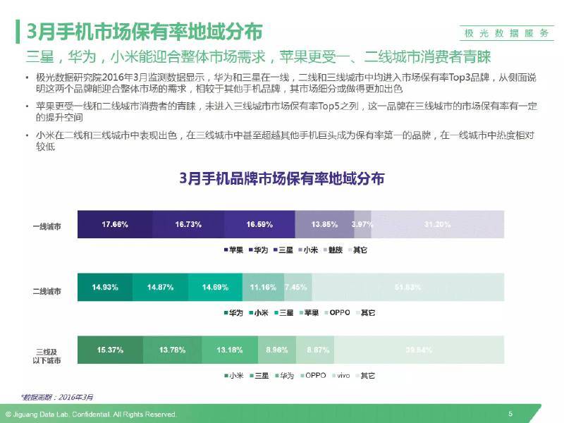 •极光数据研究院2016年3月监测数据显示,华为和三星在一线,二线和三线城市中均进入市场保有率Top3品牌,从侧面说明这两个品牌能迎合整体市场的需求,相较于其他手机品牌,其市场细分或做得更加出色