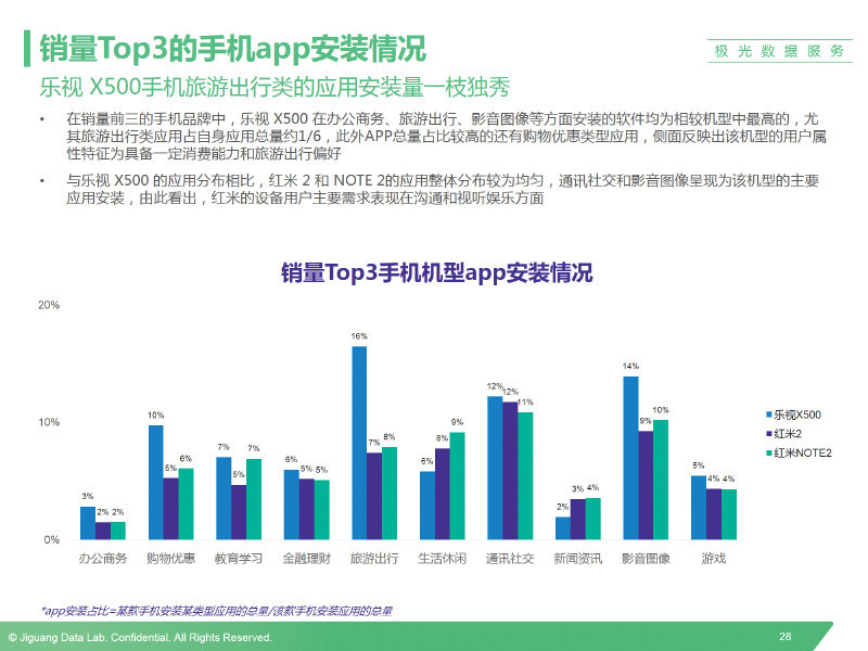 •在销量前三的手机品牌中,乐视 X500 在办公商务、旅游出行、影音图像等方面安装的软件均为相较机型中最高的,尤其旅游出行类应用占自身应用总量约1/6,此外APP总量占比较高的还有购物优惠类型应用,侧面反映出该机型的用户属性特征为具备一定消费能力和旅游出行偏好
