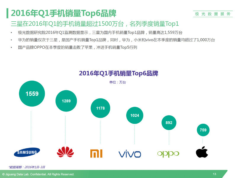 •极光数据研究院2016年Q1监测数据显示,三星为国内手机销量Top1品牌,销量高达1,559万台