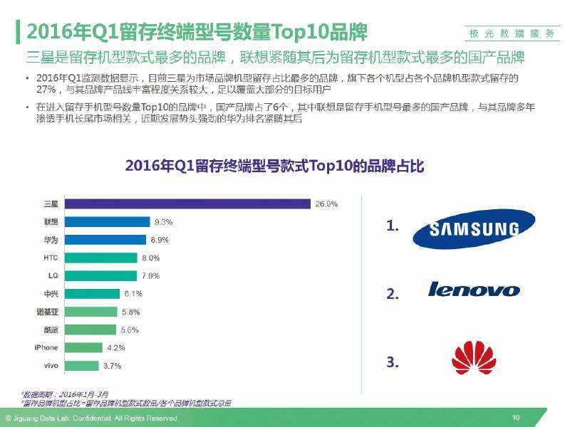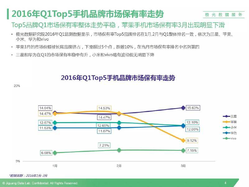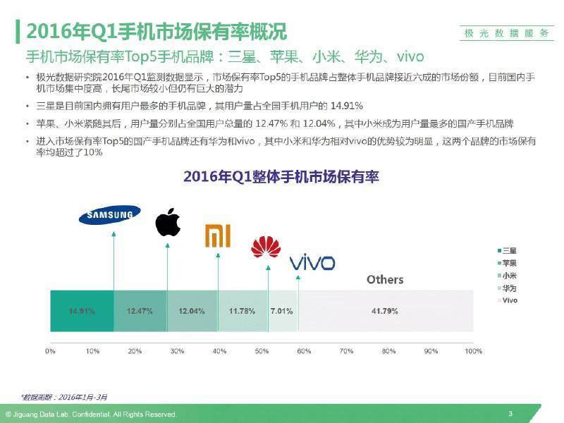 •极光数据研究院2016年Q1监测数据显示,市场保有率Top5品牌排名在1月,2月与Q1整体排名一致,依次为三星、苹果、小米、华为和vivo