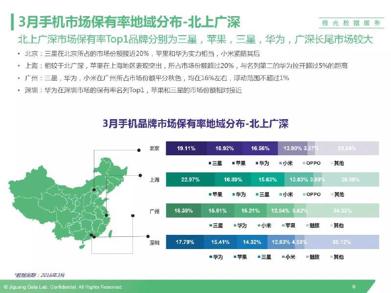 •广州:三星,华为,小米在广州所占市场份额平分秋色,均在16%左右,浮动范围不超过1%