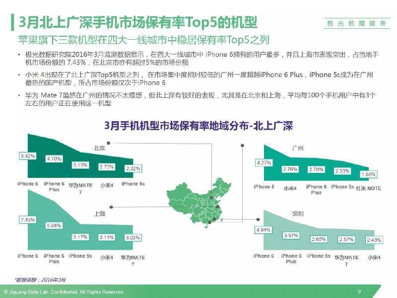 •极光数据研究院2016年3月监测数据显示,在四大一线城市中 iPhone 6拥有的用户最多,并且上海市表现突出,占当地手机市场份额的 7.43%,在北京市亦有超过5%的市场份额