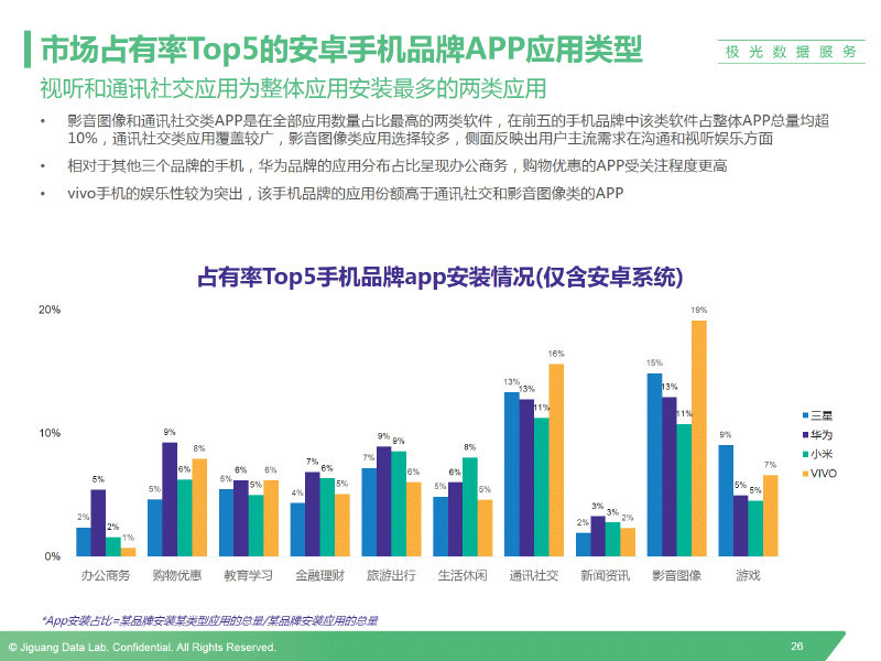 •影音图像和通讯社交类APP是在全部应用数量占比最高的两类软件,在前五的手机品牌中该类软件占整体APP总量均超10%,通讯社交类应用覆盖较广,影音图像类应用选择较多,侧面反映出用户主流需求在沟通和视听娱乐方面