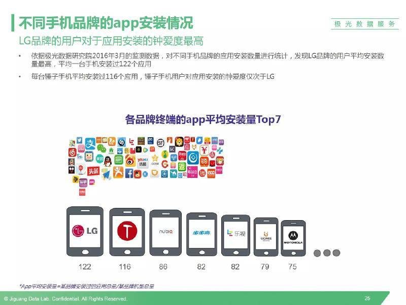 •依据极光数据研究院2016年3月的监测数据,对不同手机品牌的应用安装数量进行统计,发现LG品牌的用户平均安装数量最高,平均一台手机安装过122个应用