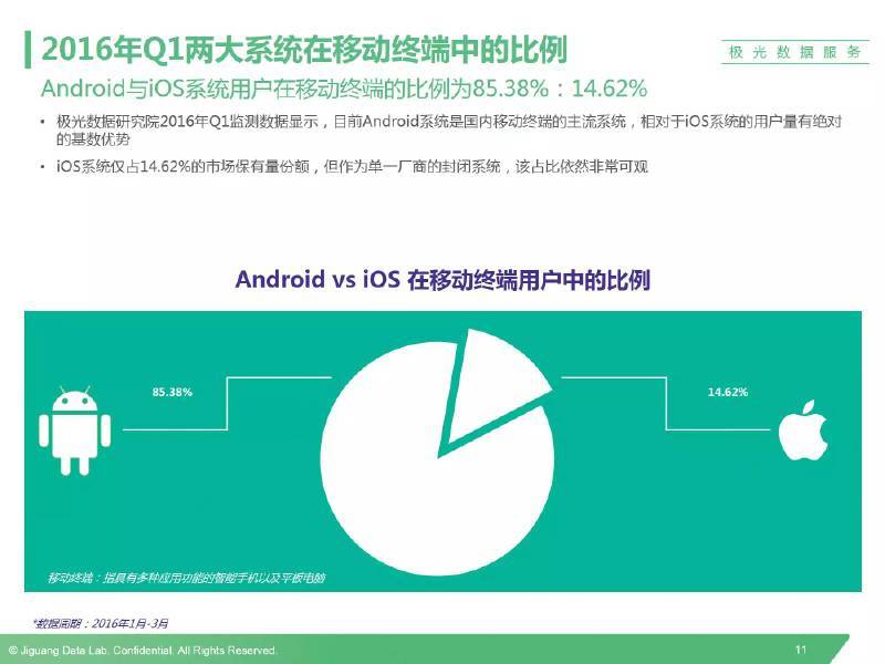 •极光数据研究院2016年Q1监测数据显示,目前Android系统是国内移动终端的主流系统,相对于iOS系统的用户量有绝对的基数优势