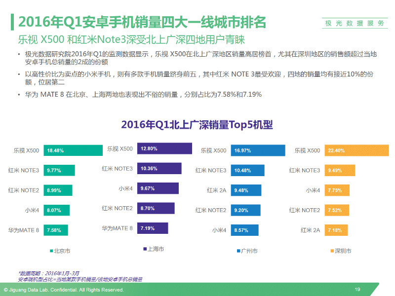 •极光数据研究院2016年Q1的监测数据显示,乐视 X500在北上广深地区销量高居榜首,尤其在深圳地区的销售额超过当地安卓手机总销量的2成的份额