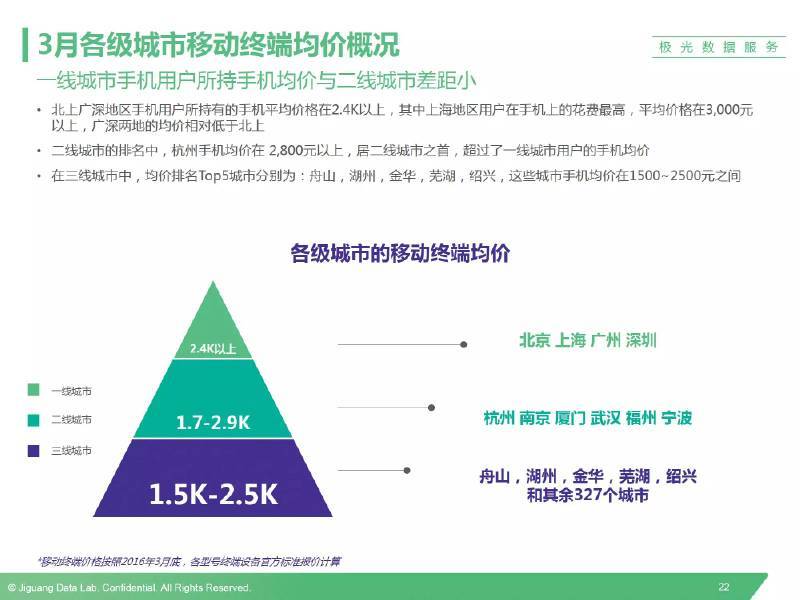 •在三线城市中,均价排名Top5城市分别为:舟山,湖州,金华,芜湖,绍兴,这些城市手机均价在1500~2500元之间