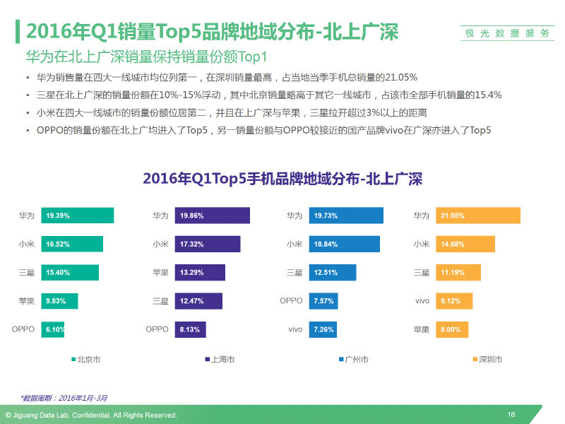 •华为销售量在四大一线城市均位列第一,在深圳销量最高,占当地当季手机总销量的21.05%