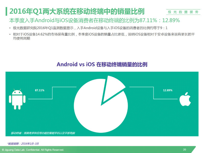 •极光数据研究院2016年Q1监测数据显示,入手Android设备与入手iOS设备的消费者的比例约等于9:1