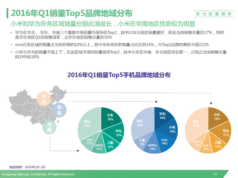 •华为在华北 、华东、华南三个重要市场销量均保持在Top2,其中以华北地区销量最好,排名当地销售总量的17%,同时是华东地区Q1的销售冠军,占华东地区销售总量的16%