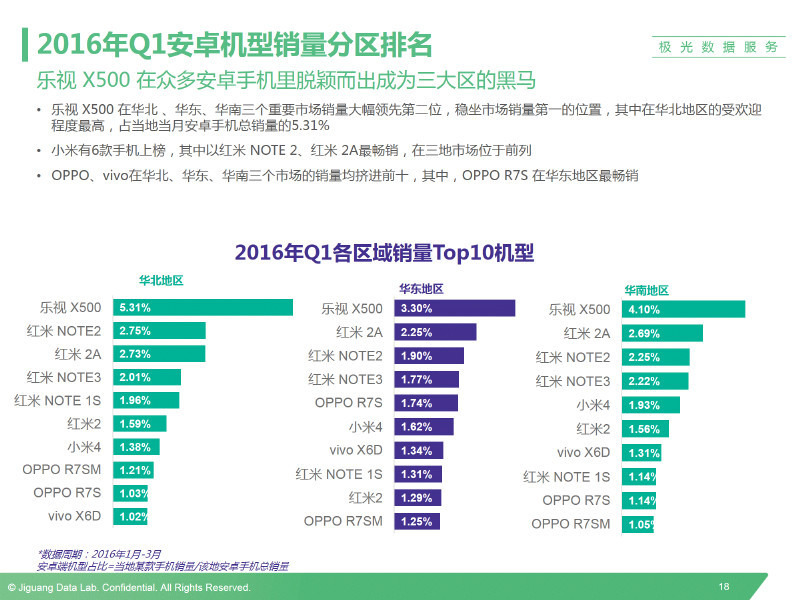 •乐视 X500 在华北 、华东、华南三个重要市场销量大幅领先第二位,稳坐市场销量第一的位置,其中在华北地区的受欢迎程度最高,占当地当月安卓手机总销量的5.31%