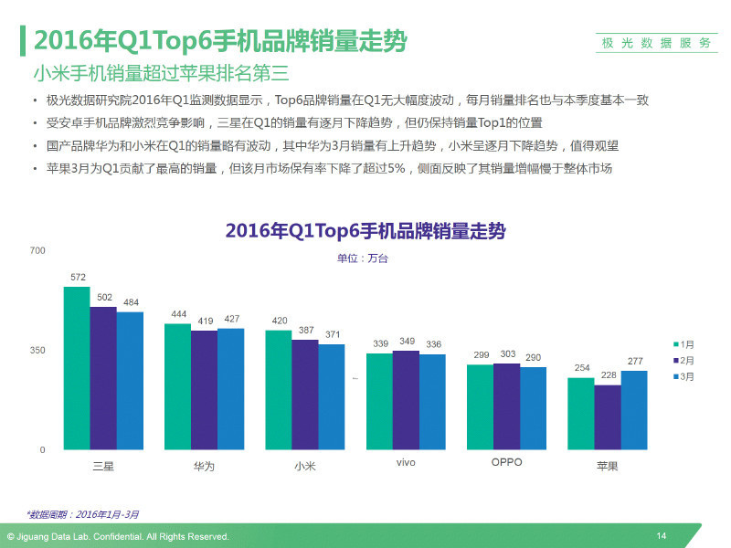 •极光数据研究院2016年Q1监测数据显示,Top6品牌销量在Q1无大幅度波动,每月销量排名也与本季度基本一致
