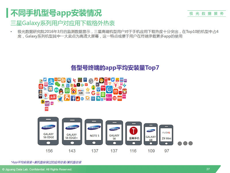 •极光数据研究院2016年3月的监测数据显示,三星高端机型用户对于手机应用下载热度十分突出,在Top10的机型中占4席,Galaxy系列机型其中一大卖点为高清大屏幕,这一特点或便于用户在终端承载更多app的使用