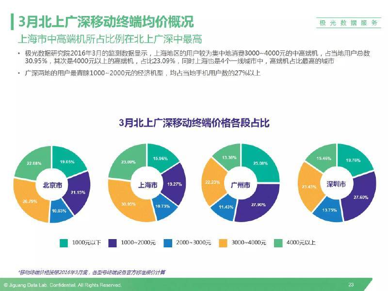 •极光数据研究院2016年3月的监测数据显示,上海地区的用户较为集中地消费3000~4000元的中高端机,占当地用户总数30.95%,其次是4000元以上的高端机,占比23.09%,同时上海也是4个一线城市中,高端机占比最高的城市
